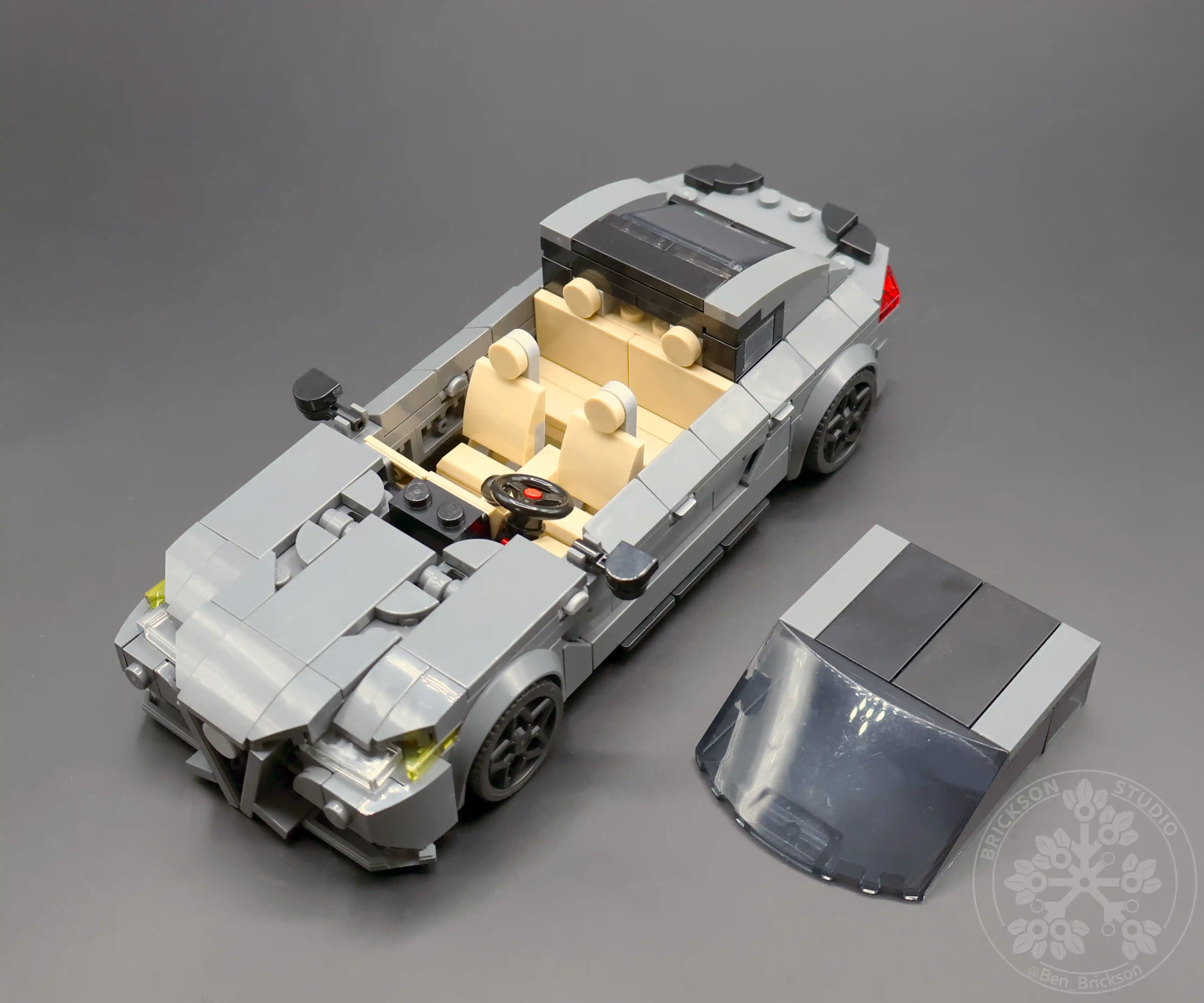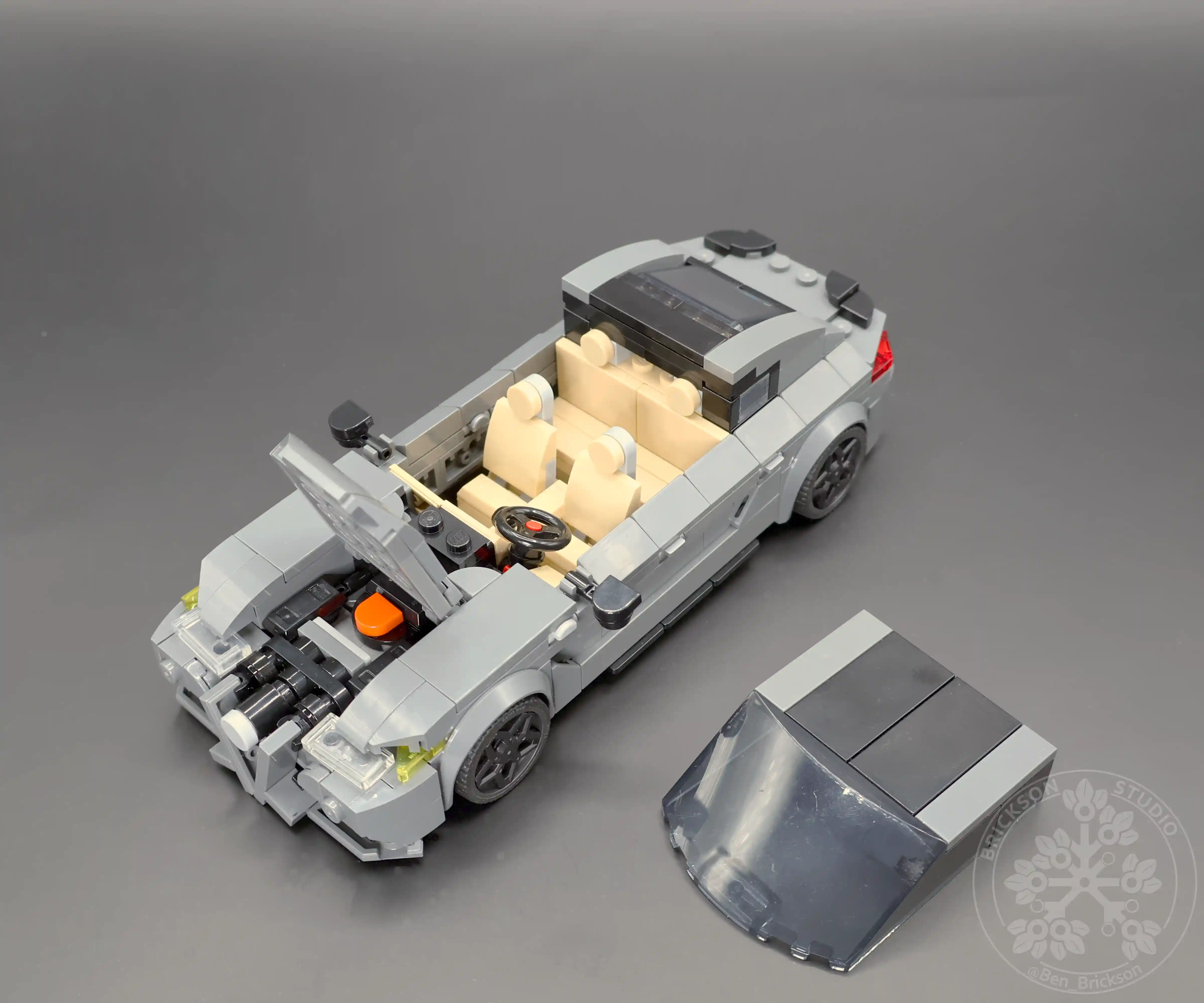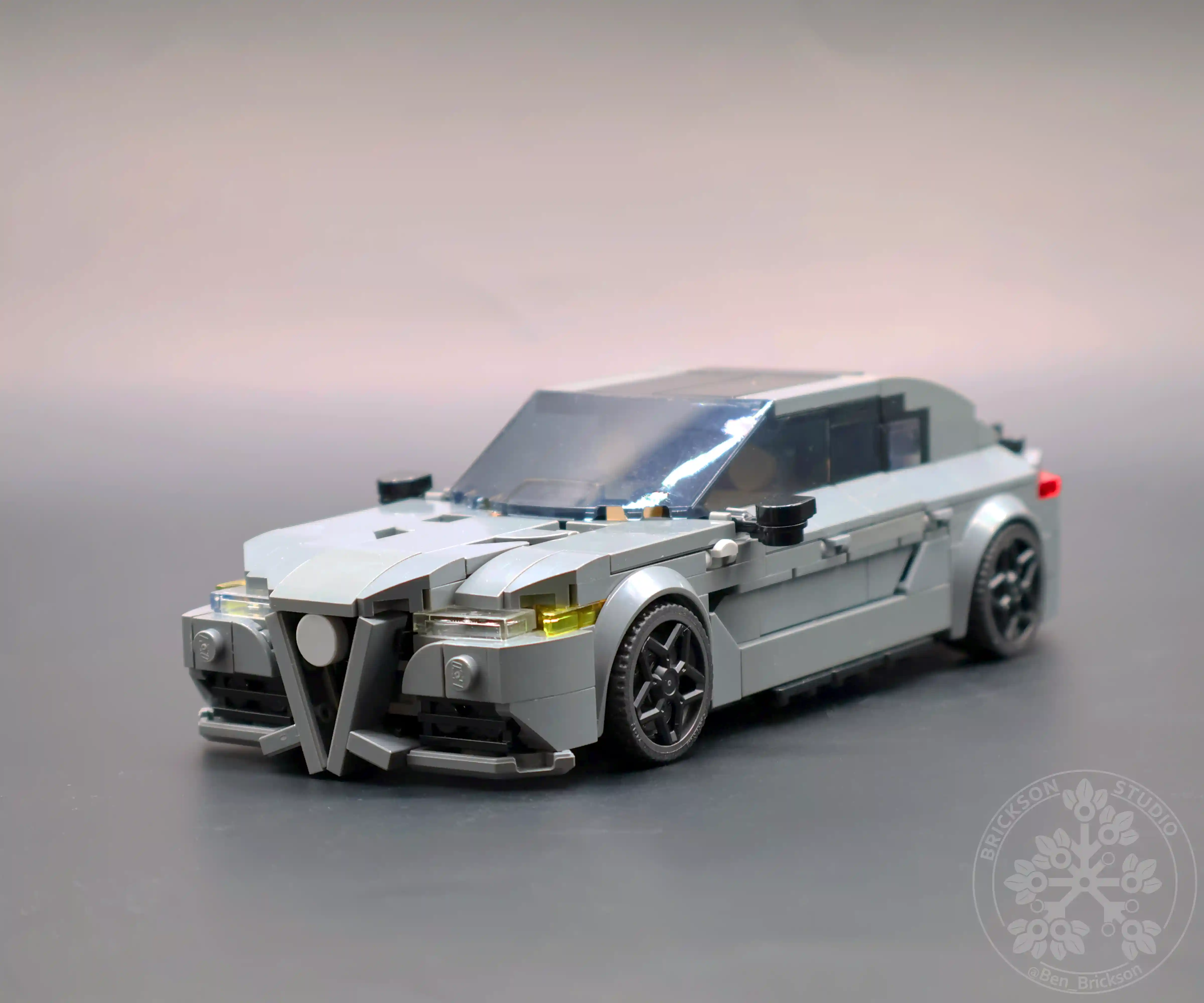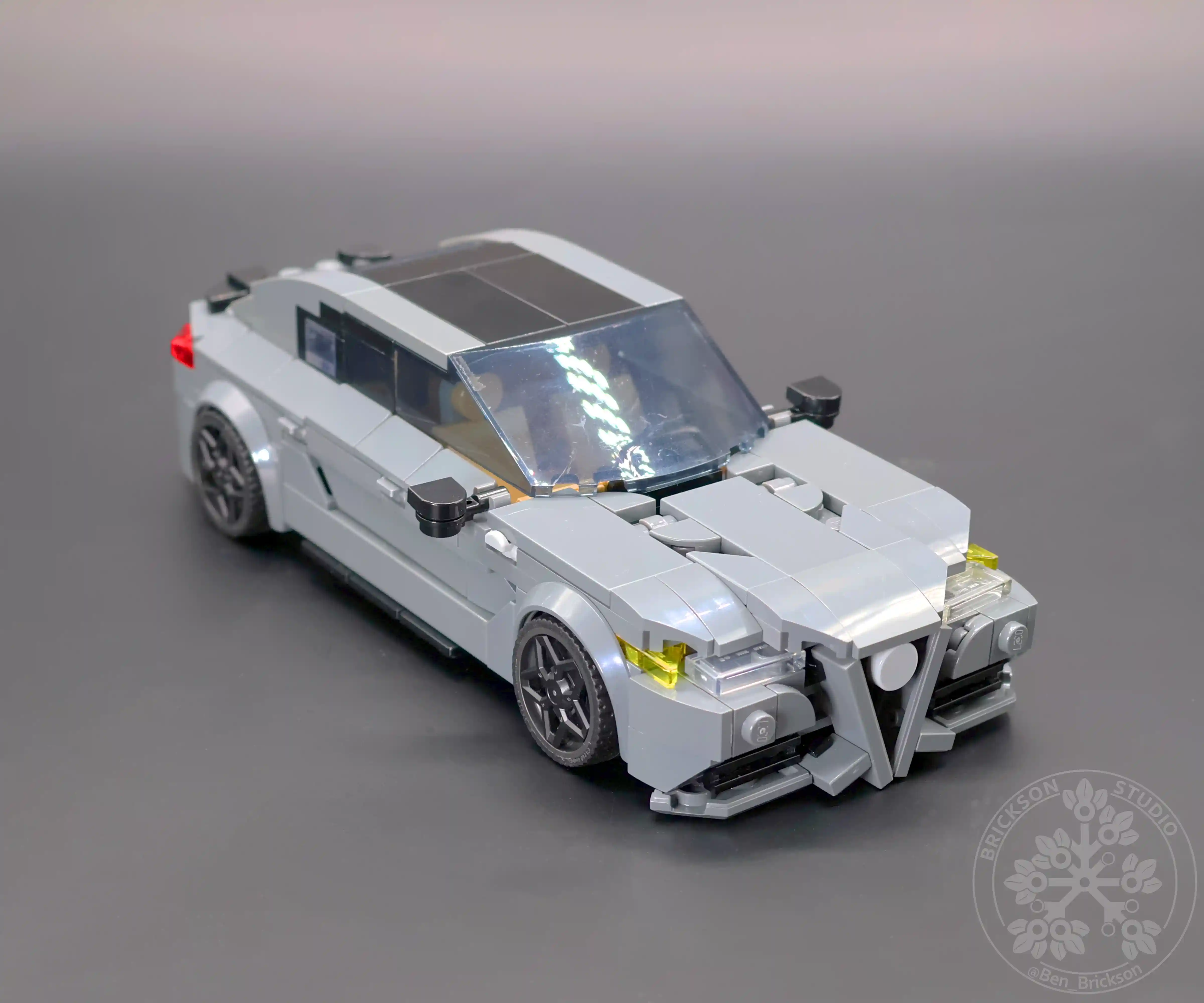 The Alfa Romeo has an iconic front grill shape, and capture those sharp angles with LEGO, a variety of different offset techniques needed to be employed. Both the 1x1 and 1x3 tiles used in the front connect into a round clip and bar assembling nesting on an odd number grid, where the headlight assemblies then make up that difference to fill in, and attempt to match, the outer edge of the car.