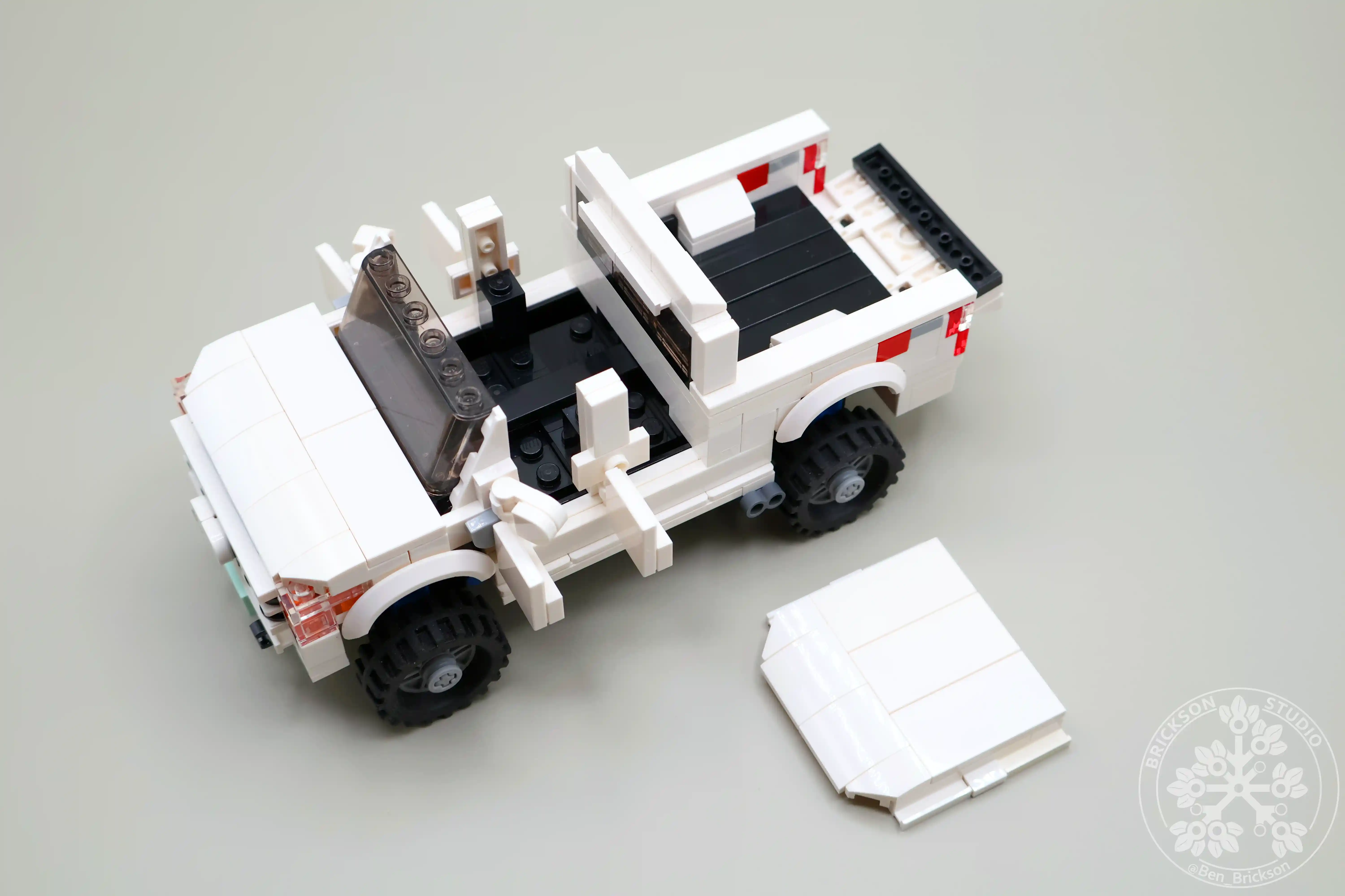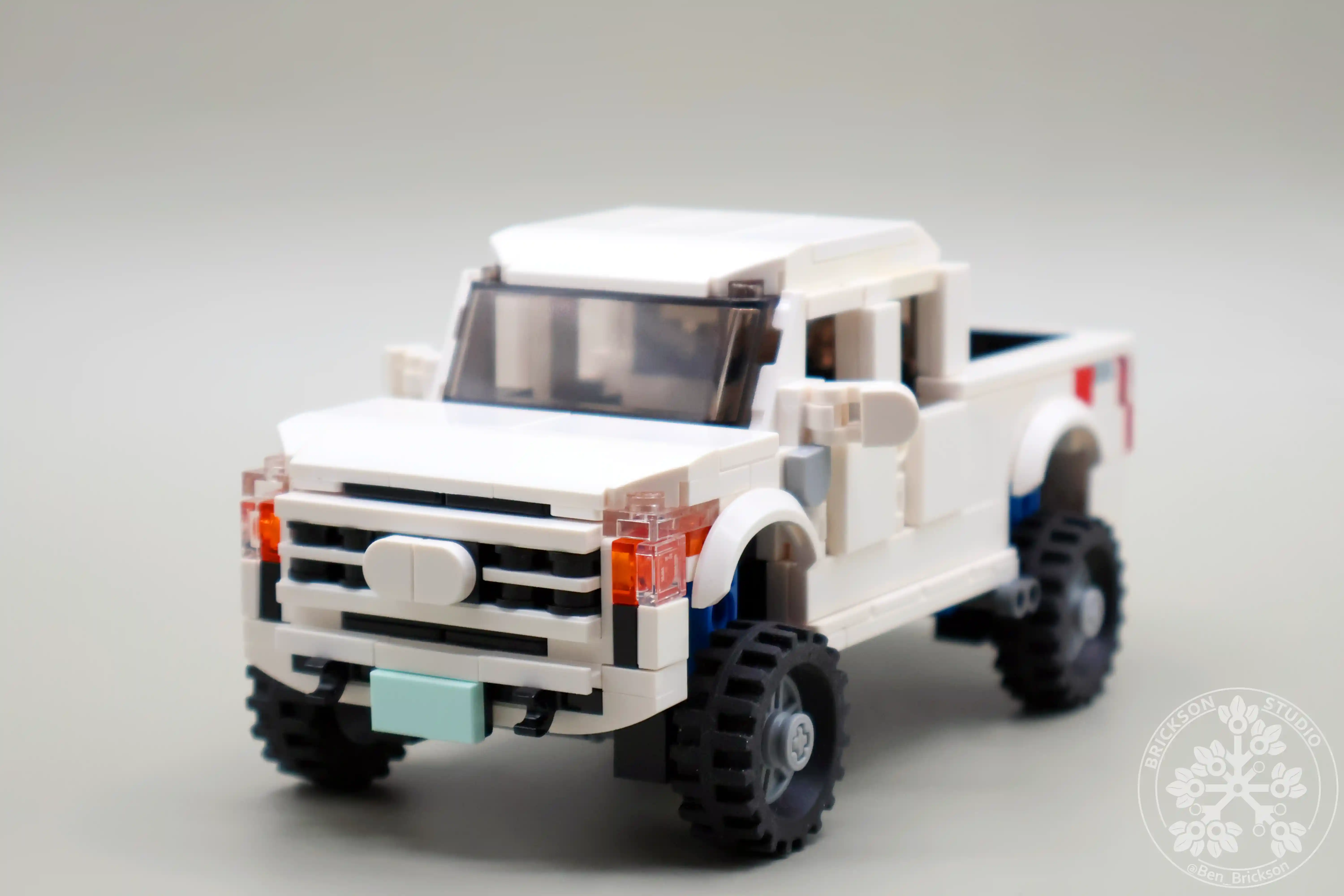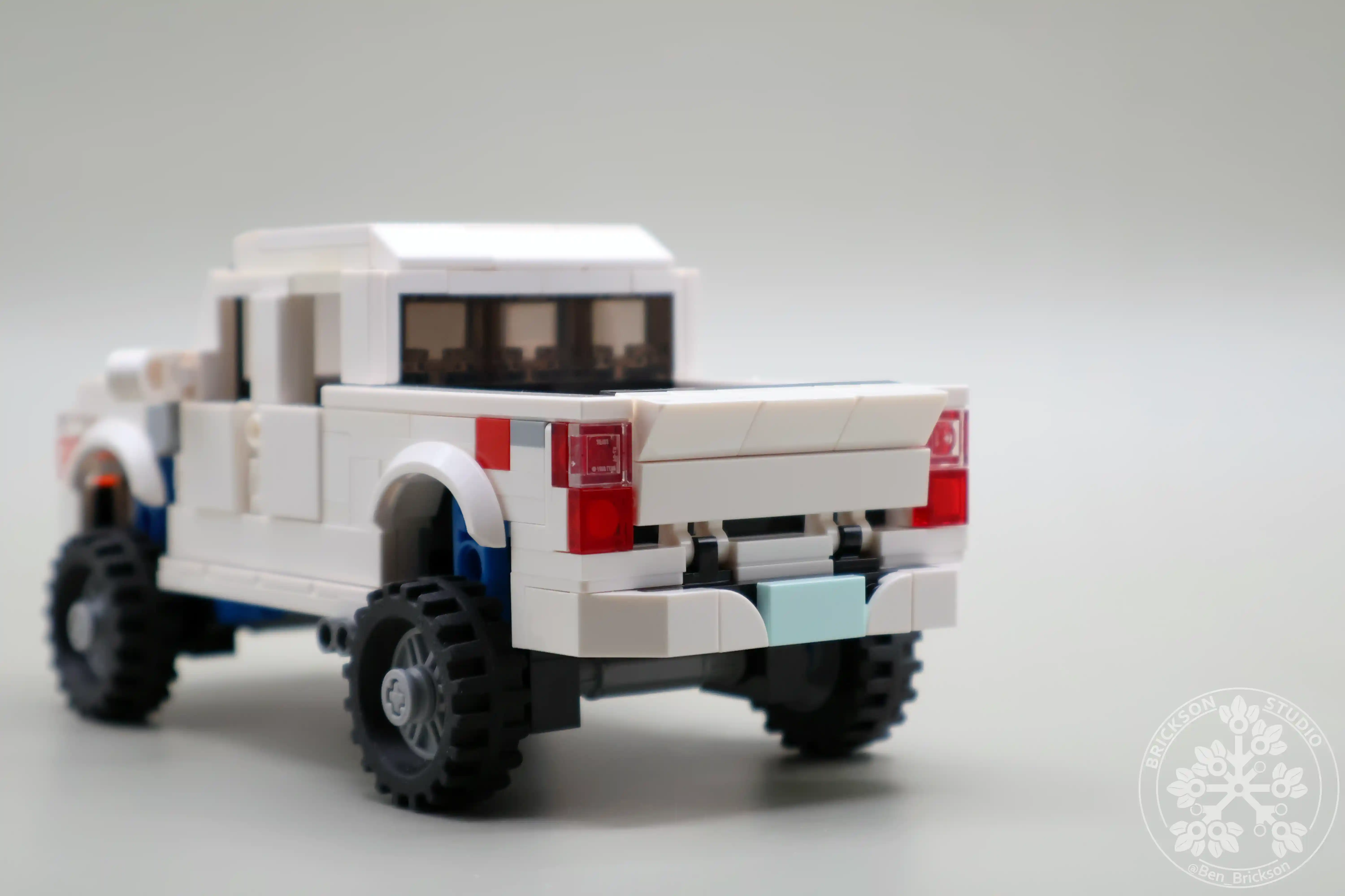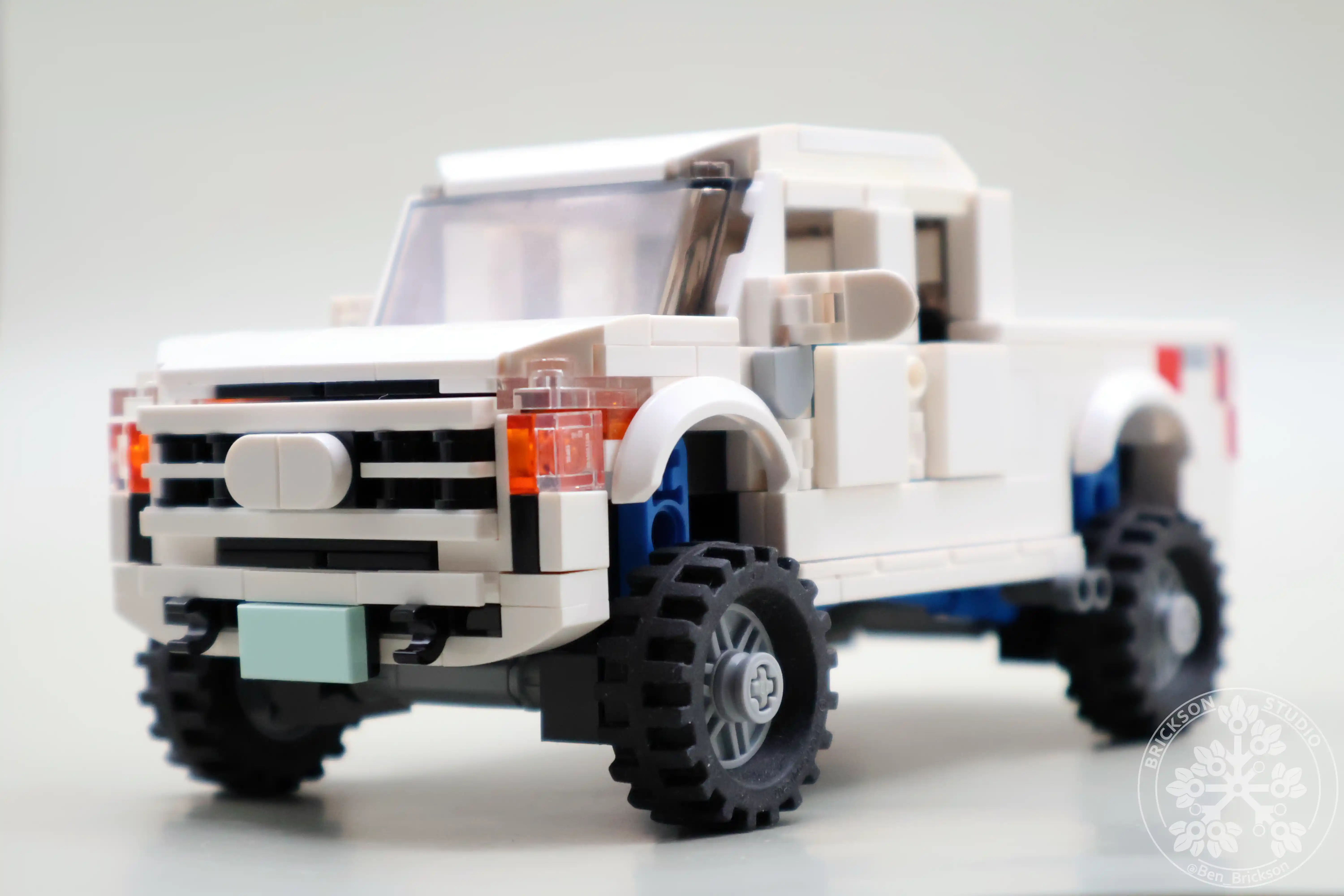 The front of the model utilizes not only stacked and offset plate to capture the many grill lines, but also bracket edges to capture thinner grill reveals at a half-plate height. Technic half beams along with bar supports give the slight indictations of a hidden lift kit beyond the model.