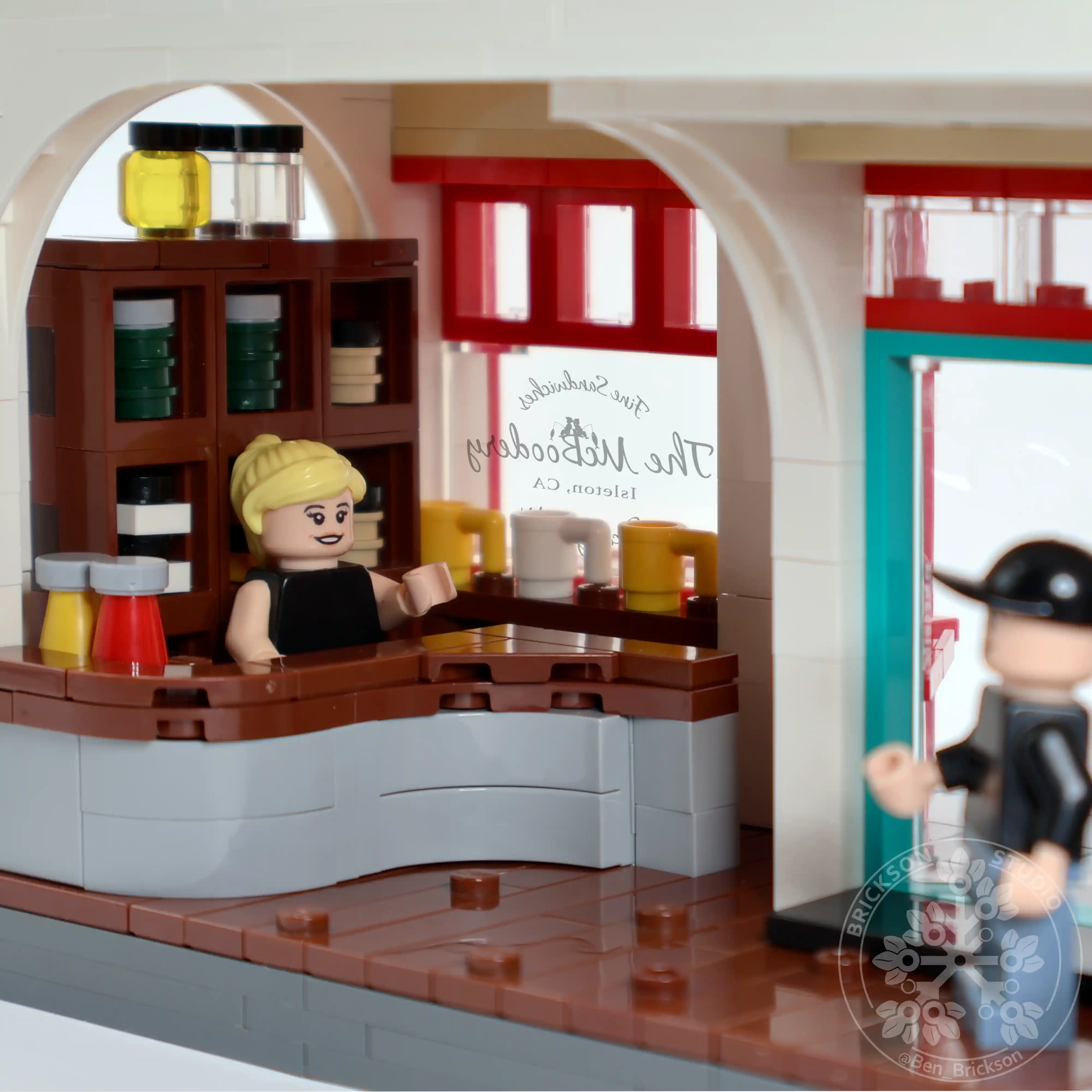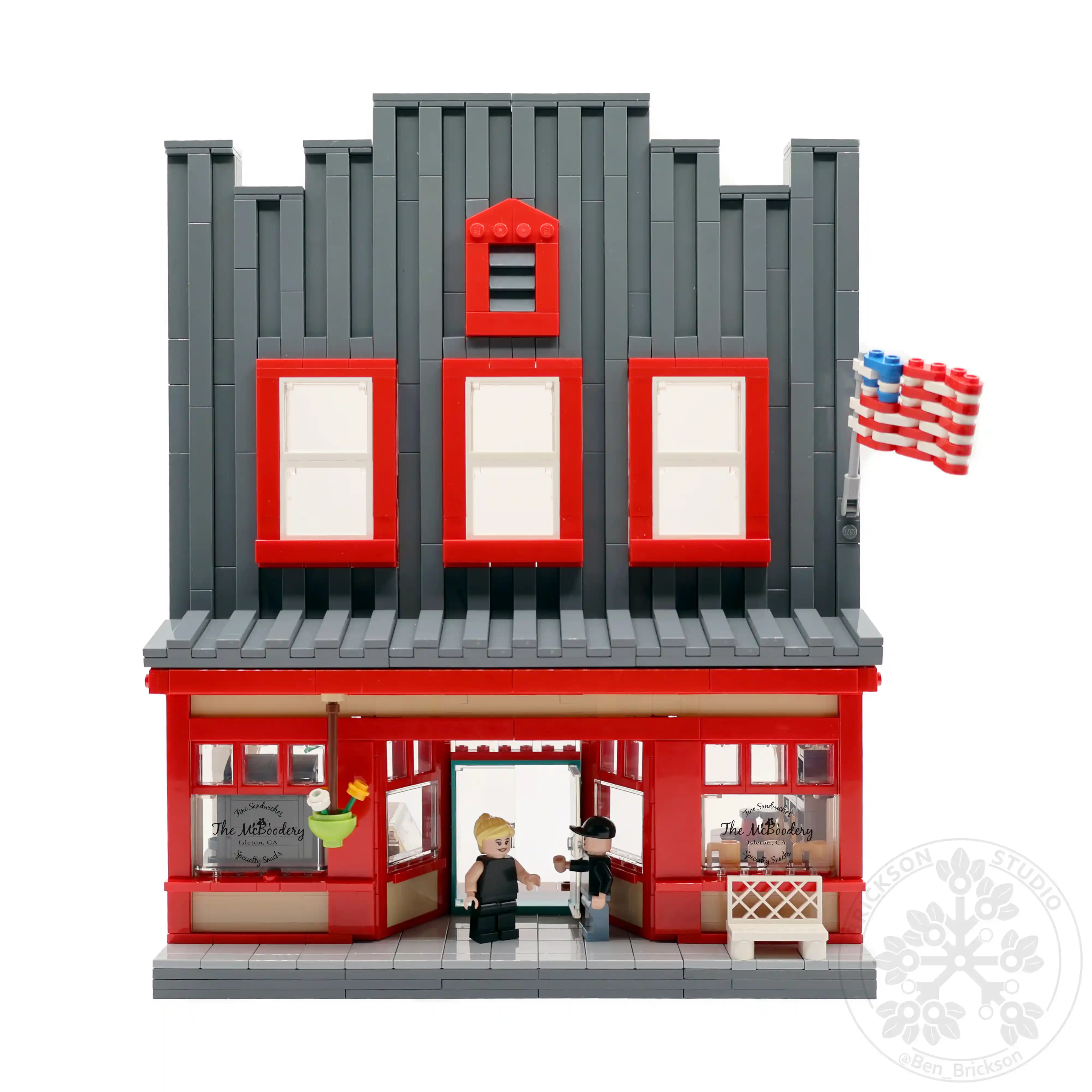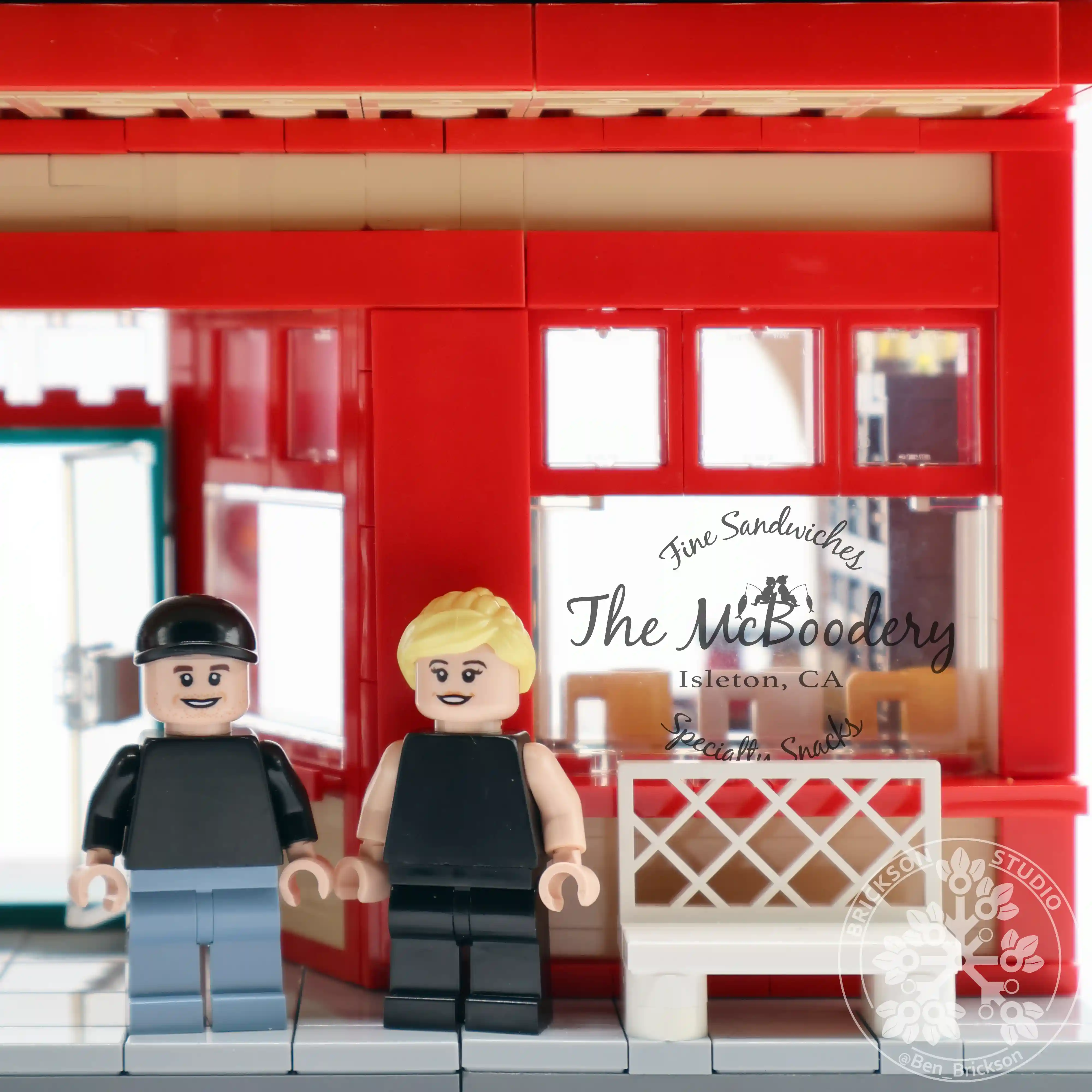 This playset-style set of the McBoodery, a real sandwich shop located in Isleton, CA, gave me the challenge of trying something different - capturing the facade and essence of the building in a smaller footprint. The shop's exterior matches that of the actual location, while rearranging the interior to depict the essence of it in a smaller footprint. The curving counter for taking orders, the cabinet of sauces and merch for sale, the iconic boat filled with bags of chips, and the dessert/cold storage counter next to the kitchen.