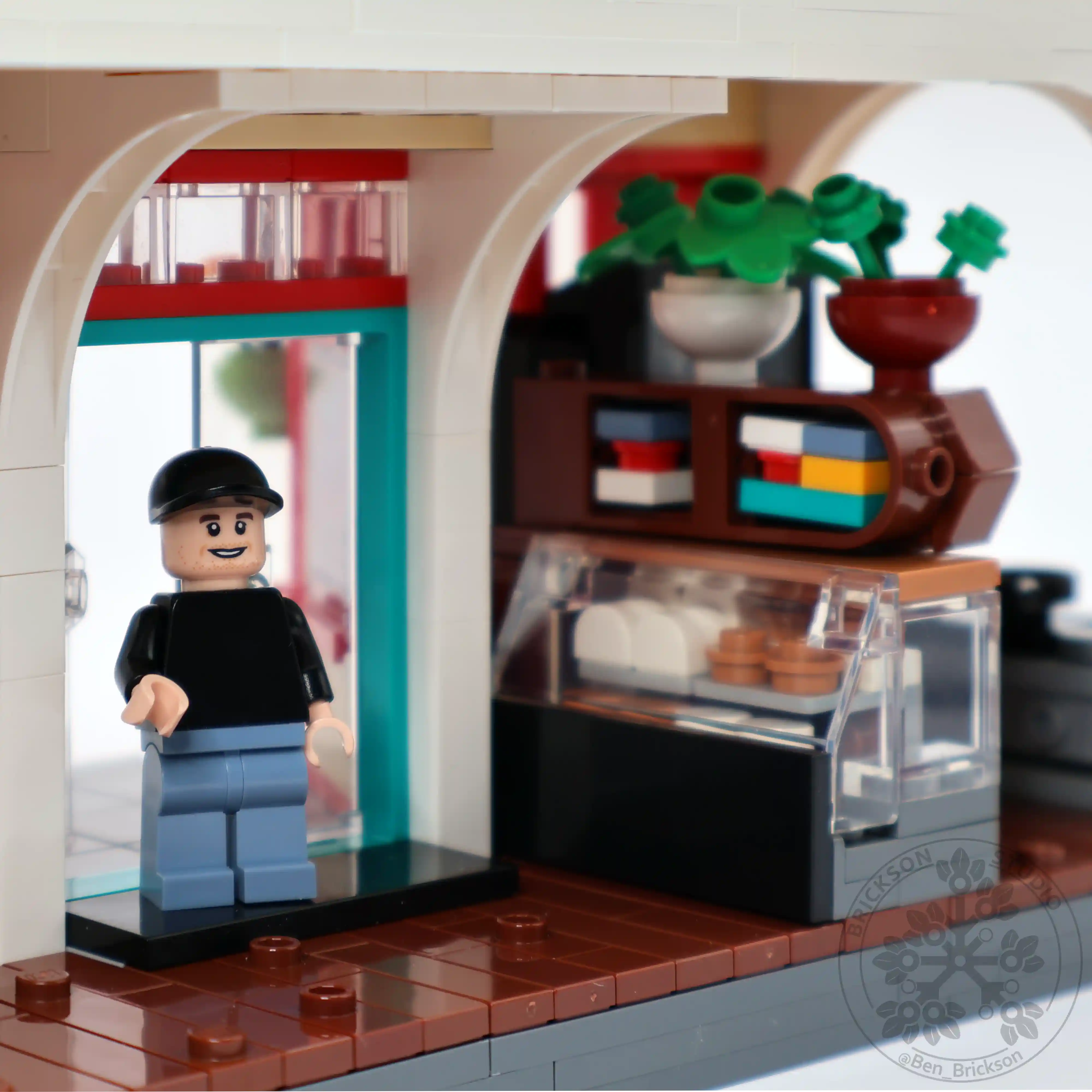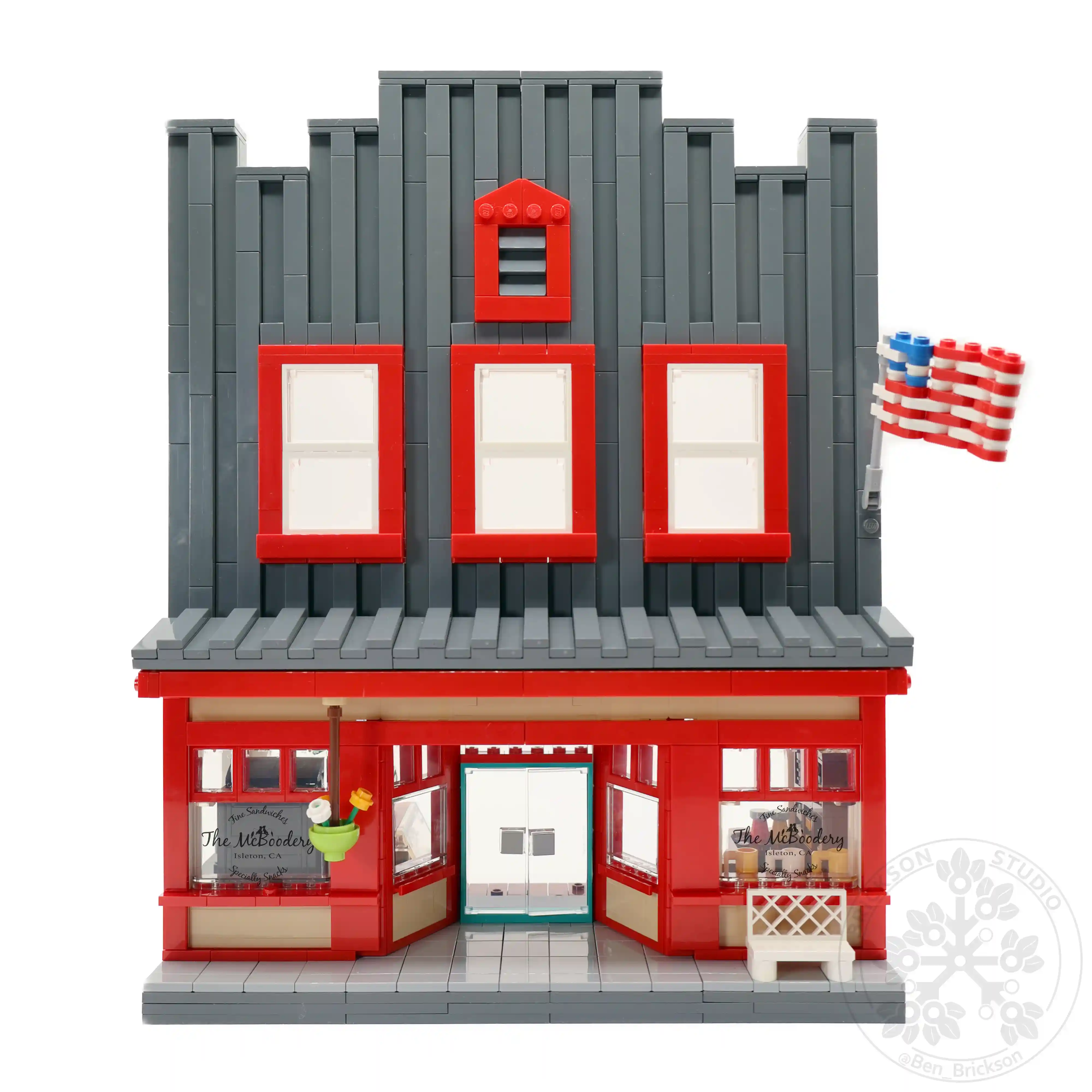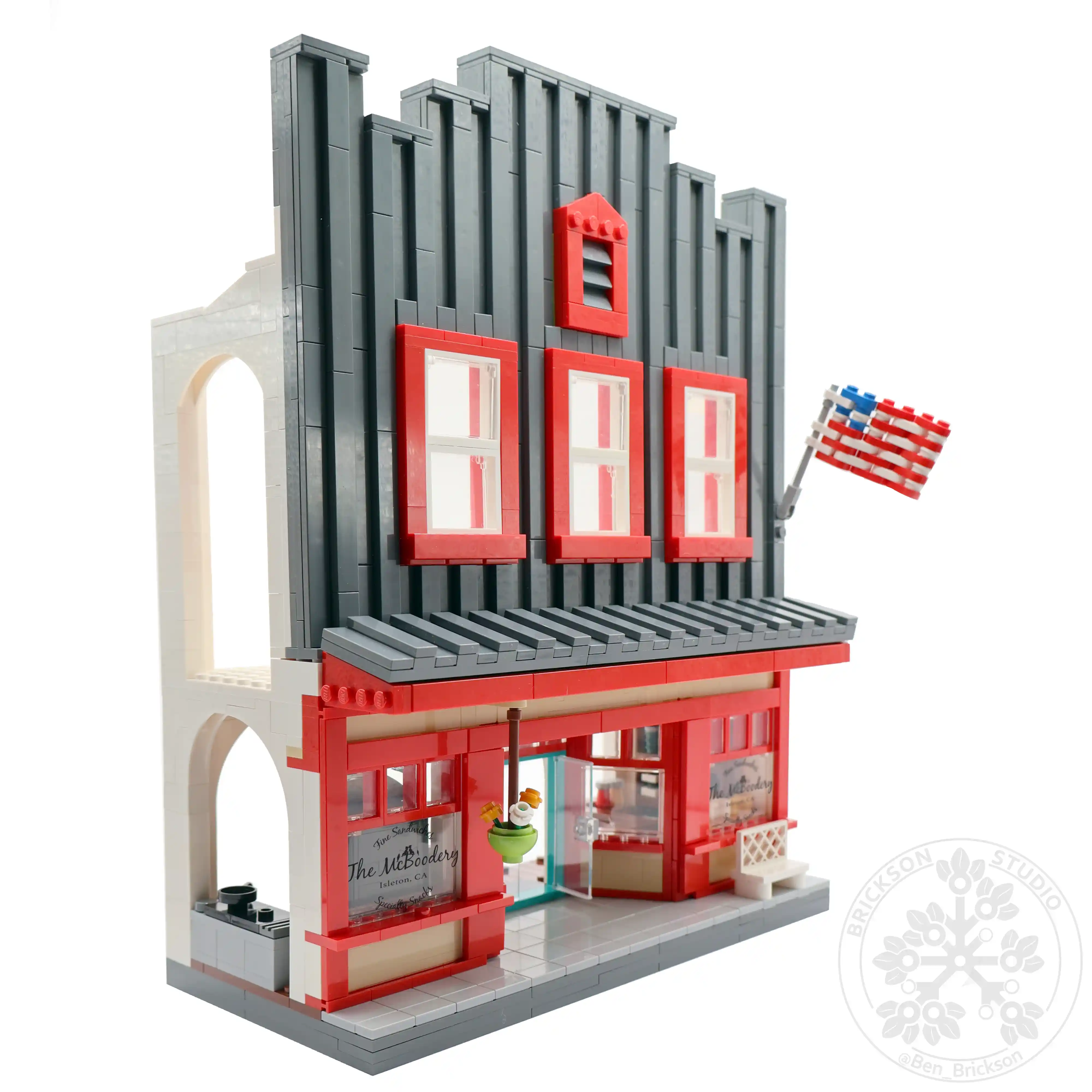 This playset-style set of the McBoodery, a real sandwich shop located in Isleton, CA, gave me the challenge of trying something different - capturing the facade and essence of the building in a smaller footprint. The shop's exterior matches that of the actual location, while rearranging the interior to depict the essence of it in a smaller footprint. The curving counter for taking orders, the cabinet of sauces and merch for sale, the iconic boat filled with bags of chips, and the dessert/cold storage counter next to the kitchen.
