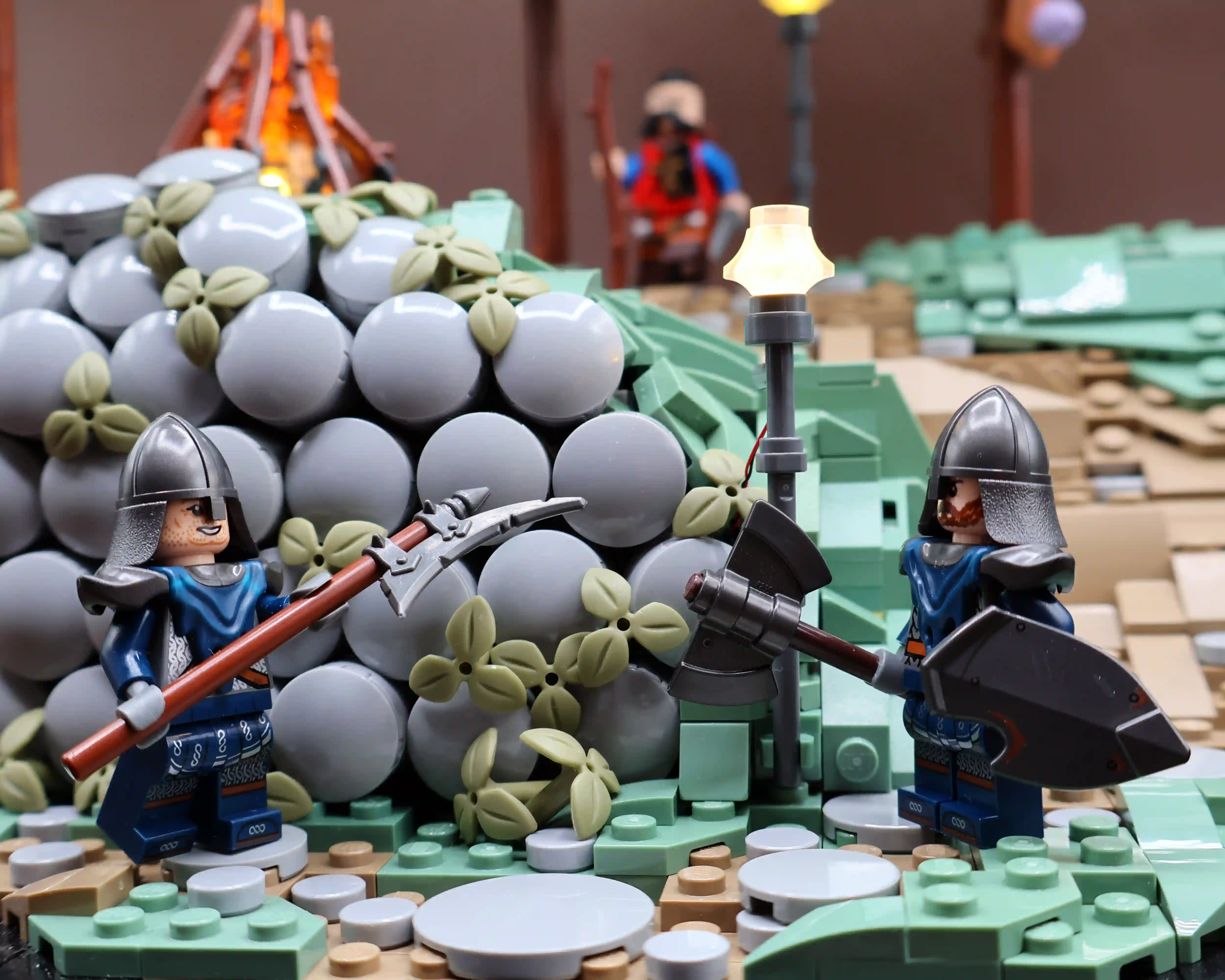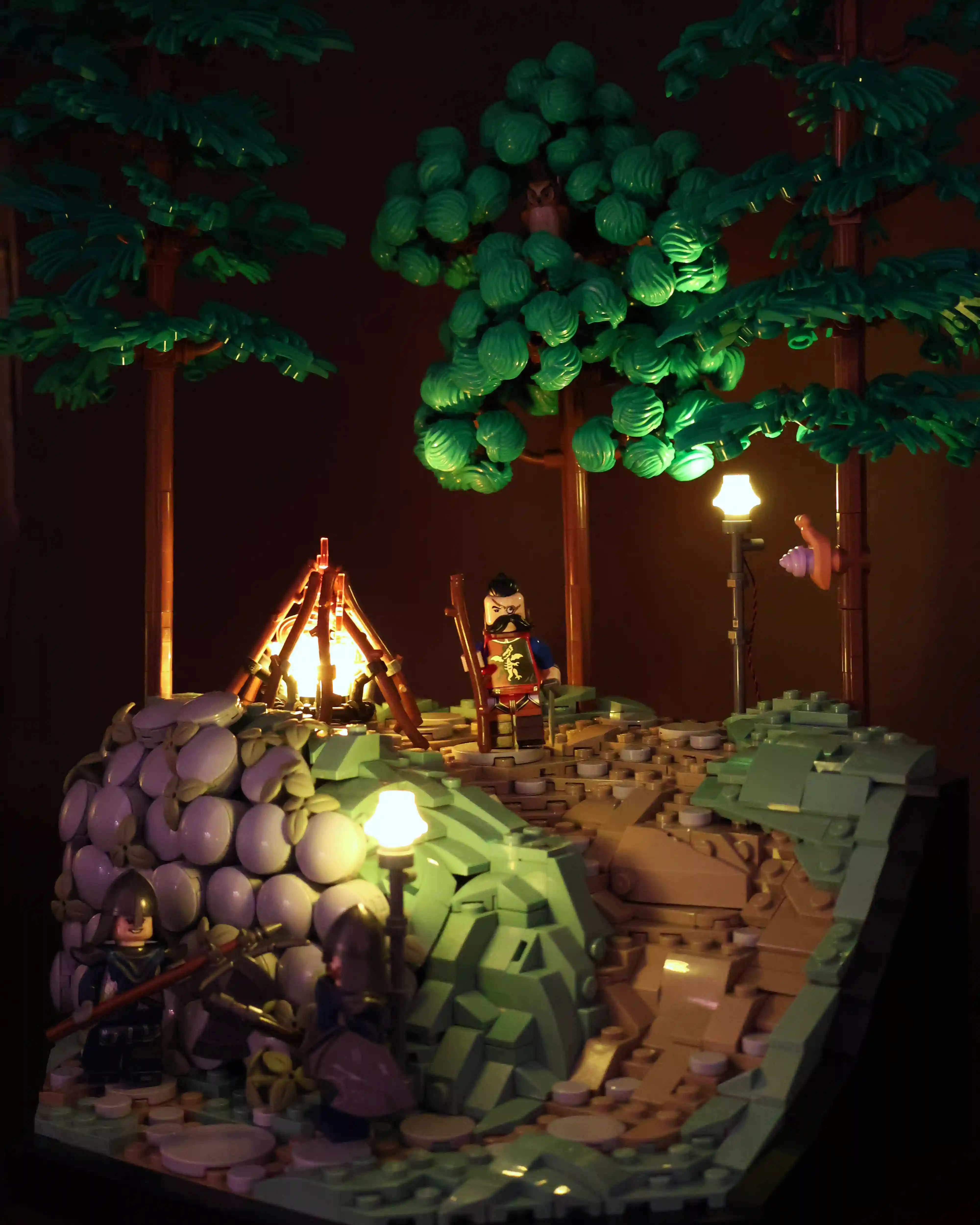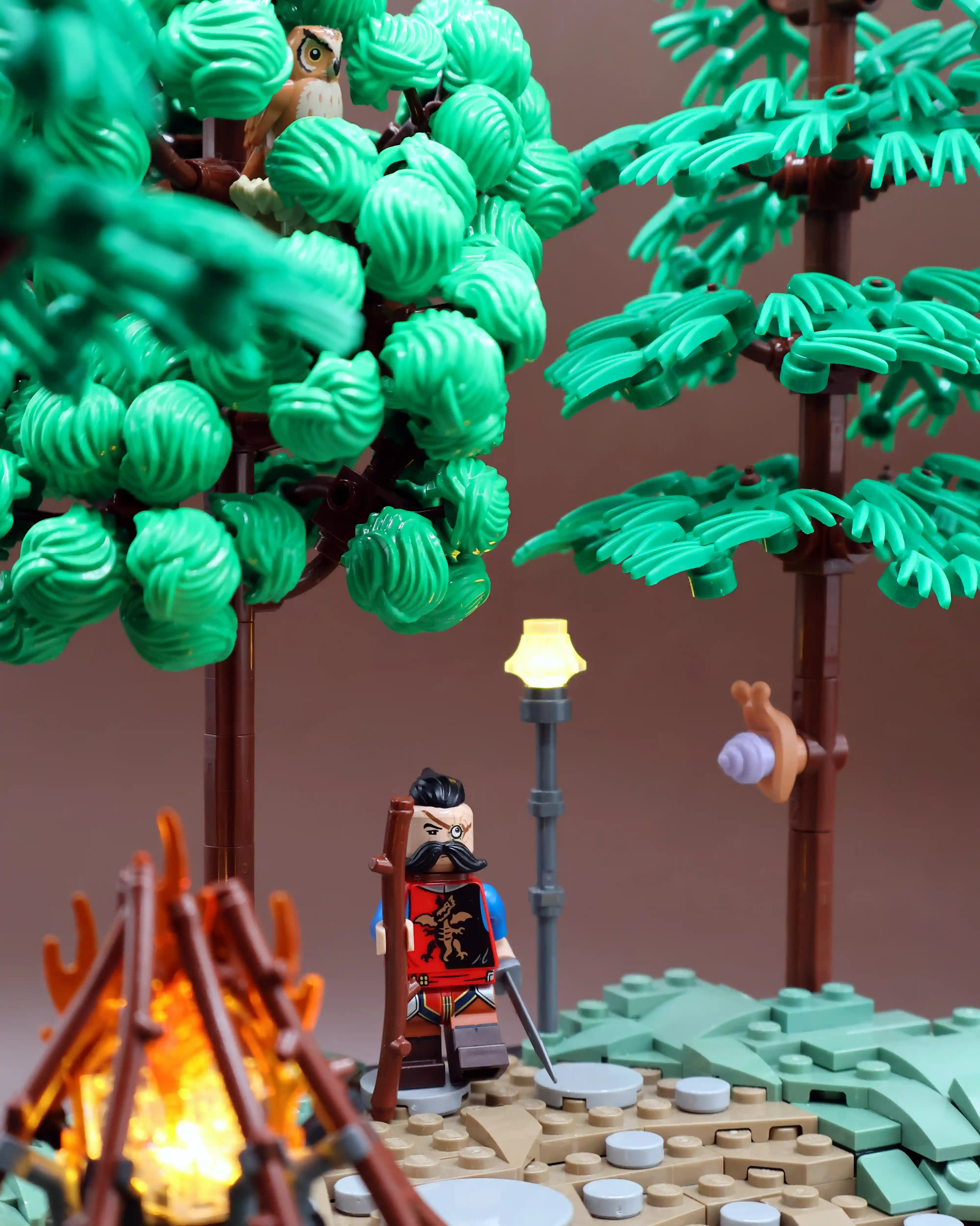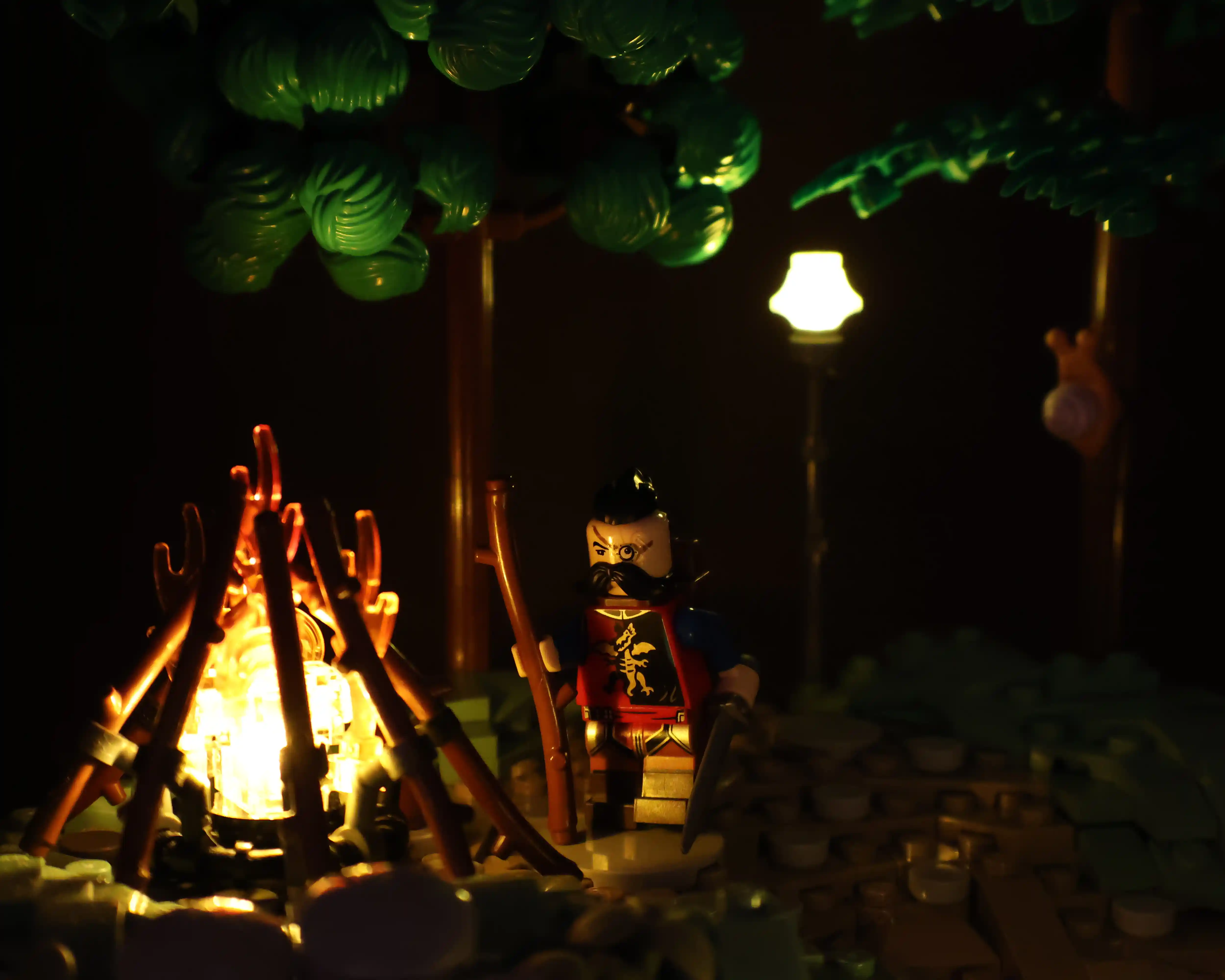 The dark shots with sublte glows from lanterns and the camfire give the scene a fun abiance and glow. Each utilizes BrickStuff flicker effect lights that give subtle motion to the build when viewed. The campfire's glow from the lights was an incredibly fun design to play with. And with the help of custom sticks produced by Citizenbrick, a bit more lively detial gets added to the scene.
