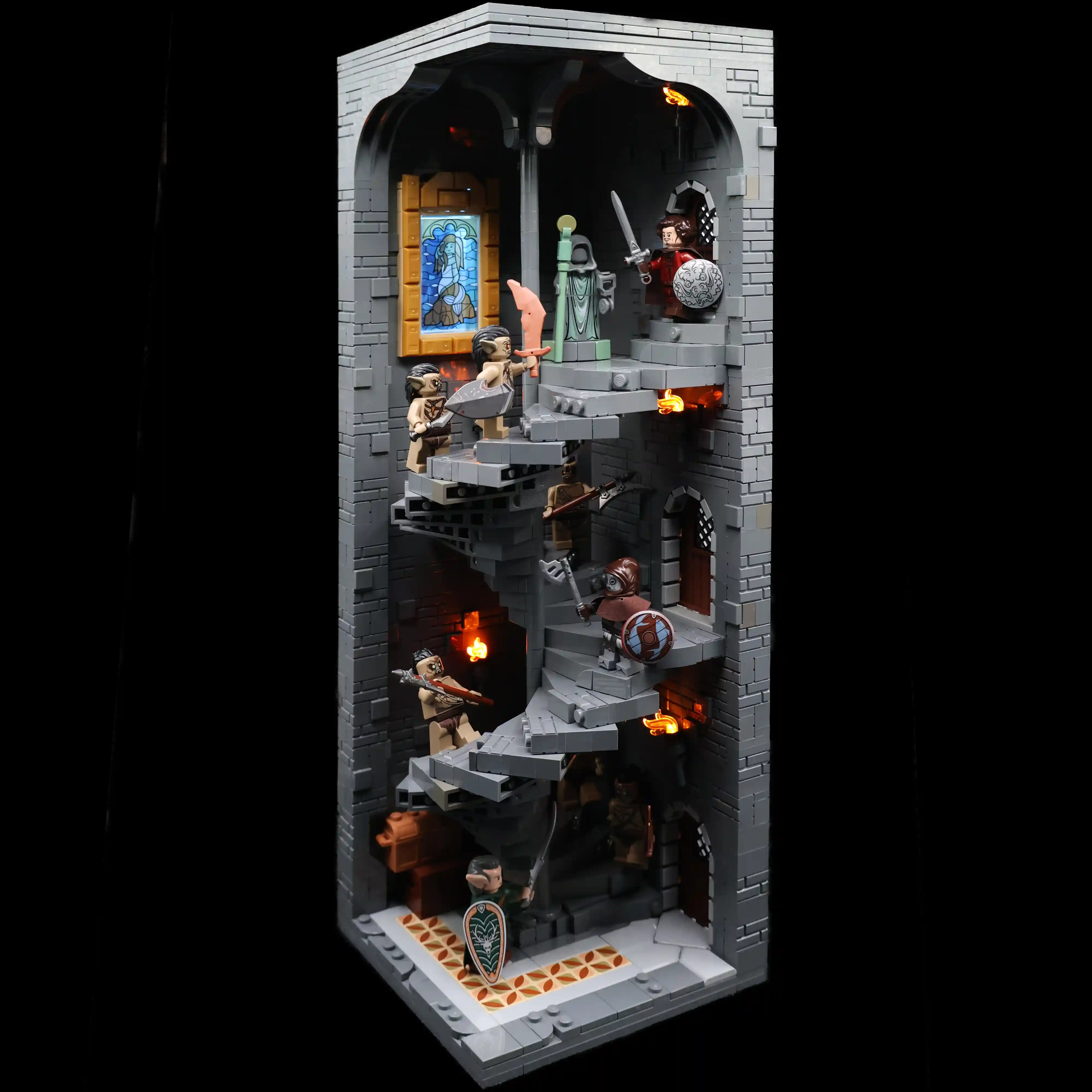 To create this spiral stair case, the main points of attchment for the steps would be the floor and ceiling of the chamber so the stair appears as if it is floating or suspended within the space. A few attachment points connect stairs to one of the back walls, but very few. Each step has a snot brick pointing a stud downwards to keep the steps beneath it rotated and pushed into its palce. This allows for the steps to appear uniform around the long technic axle running from floor to ceiling within the space.