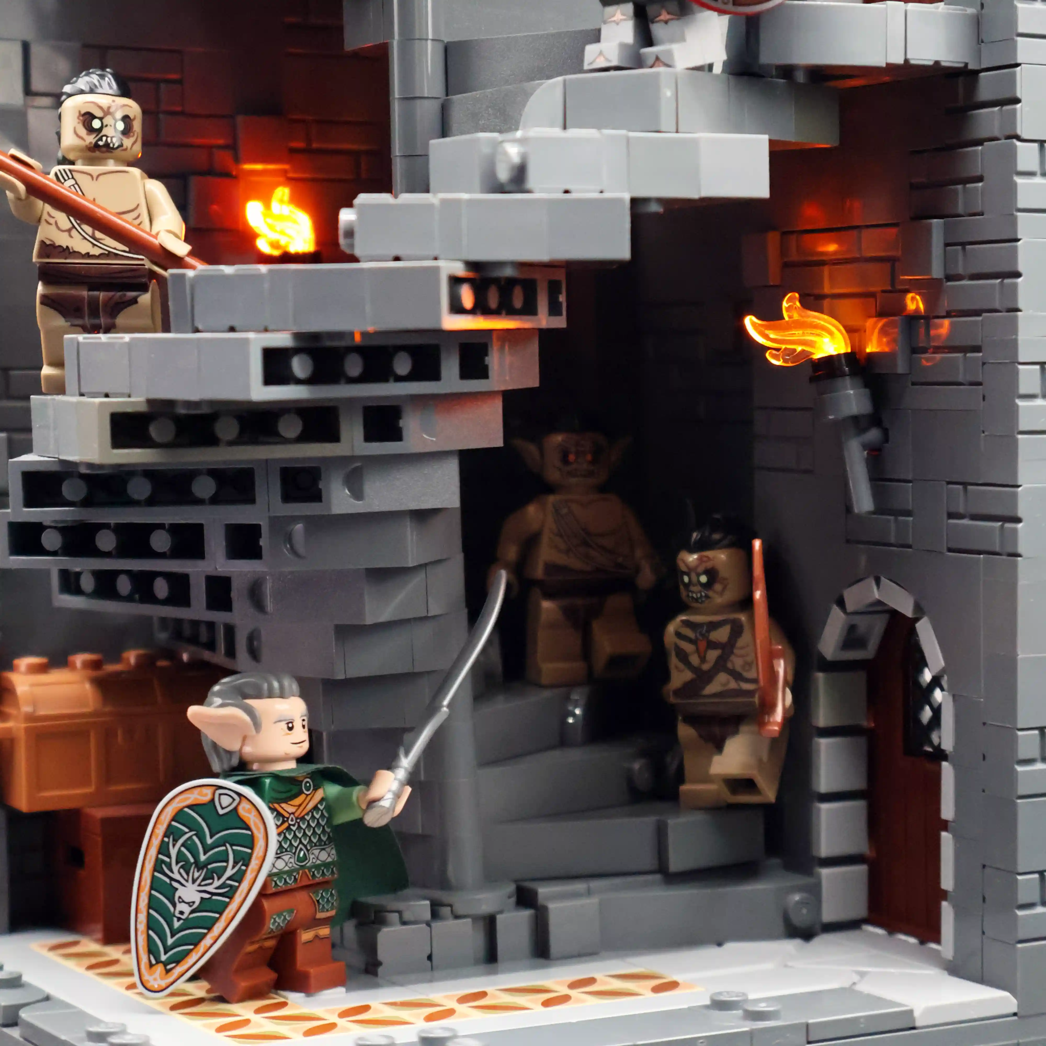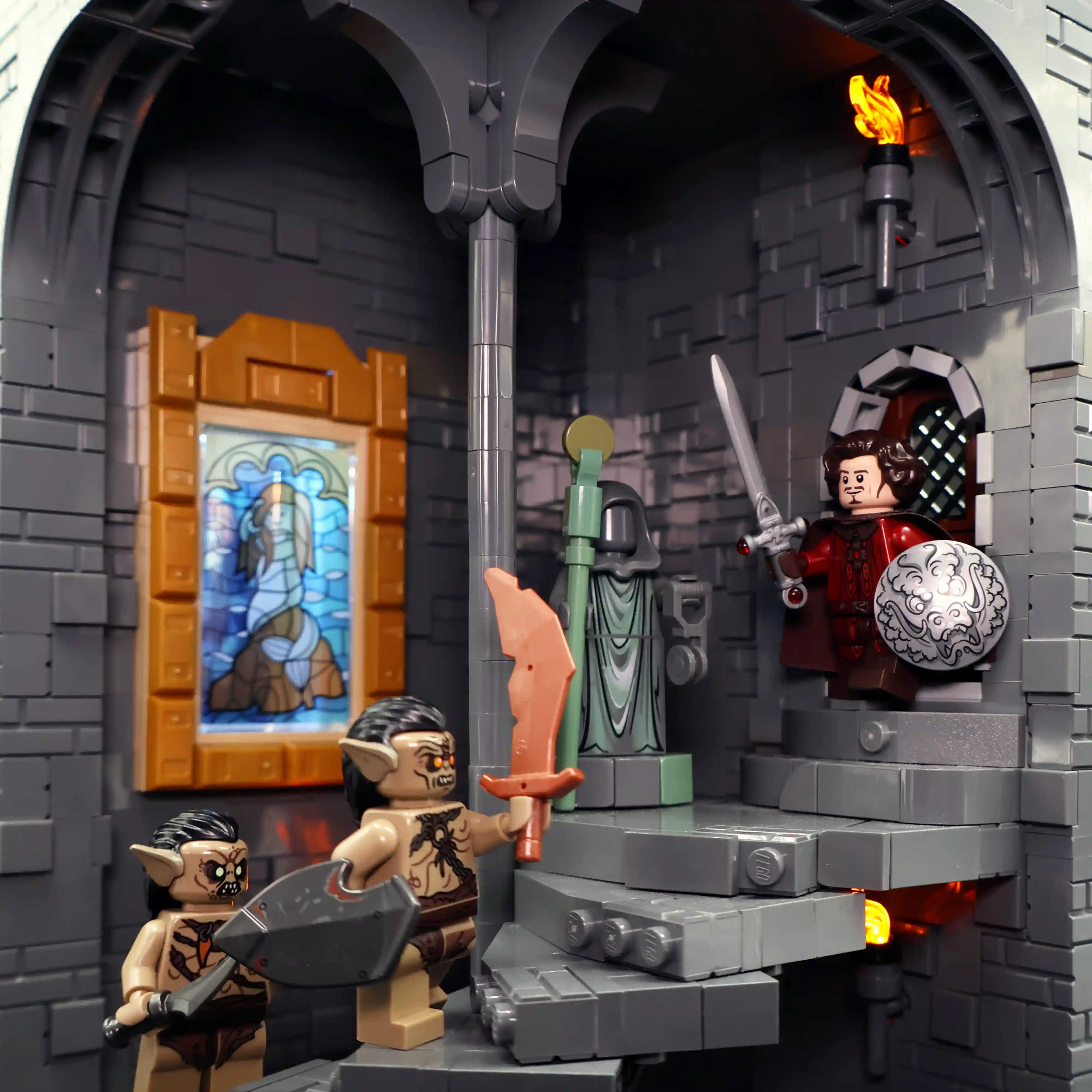 Lighting effects are done utilizngrickStuff's flicker effects lights, and with the lighting source not looking too harshly into the build for photographing the model, patches of shadow where the torches are is illuminated much more than it is other times. To capture a better sense of motion beyond the stained glass window of the mermaid, a mirror panel is inserted a few studs back. This allowed for being viewed form angl vs the other, the stained glass' own reflection in the mirror beyond looked like it was at a different point than the front glass creating a bit of an optical illusion.
